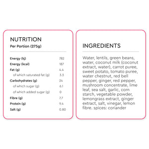 Lentils, Green beans, Coconut milk (coconut extract, water), Carrot puree, Sweet potato, Tomato puree, Water chestnut, Red bell pepper, Spices, Ginger, Red pepper, Mushroom concentrate, Lime leaf, Sea salt, Garlic, Corn starch, Vegetable powder, Lemongrass extract, Ginger extract, Salt, Vinegar, Lemon fibre.